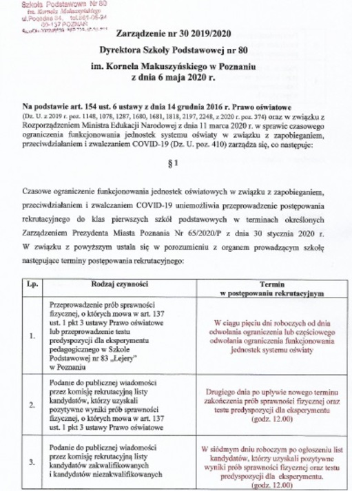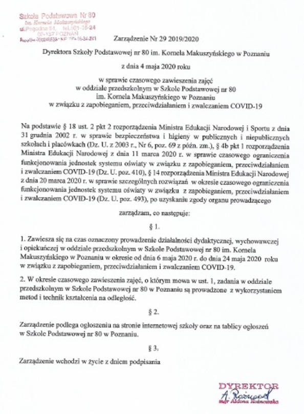 Na podstawie rozporządzenia Ministra Edukacji Narodowej z dnia 20 marca 2020 r. w sprawie szczególnych rozwiązań w okresie czasowego ograniczenia funkcjonowania jednostek systemu oświaty w związku z zapobieganiem, przeciwdziałaniem i zwalczaniem COVID-19 (Dz. U. z 2020 r., poz. 493) oraz rozporządzenia Ministra Edukacji Narodowej z dnia 20 marca 2020 r. zmieniające rozporządzenie w sprawie czasowego ograniczenia funkcjonowania jednostek systemu oświaty w związku z zapobieganiem, przeciwdziałaniem i zwalczaniem COVID-19 zarządzam, co następuje: